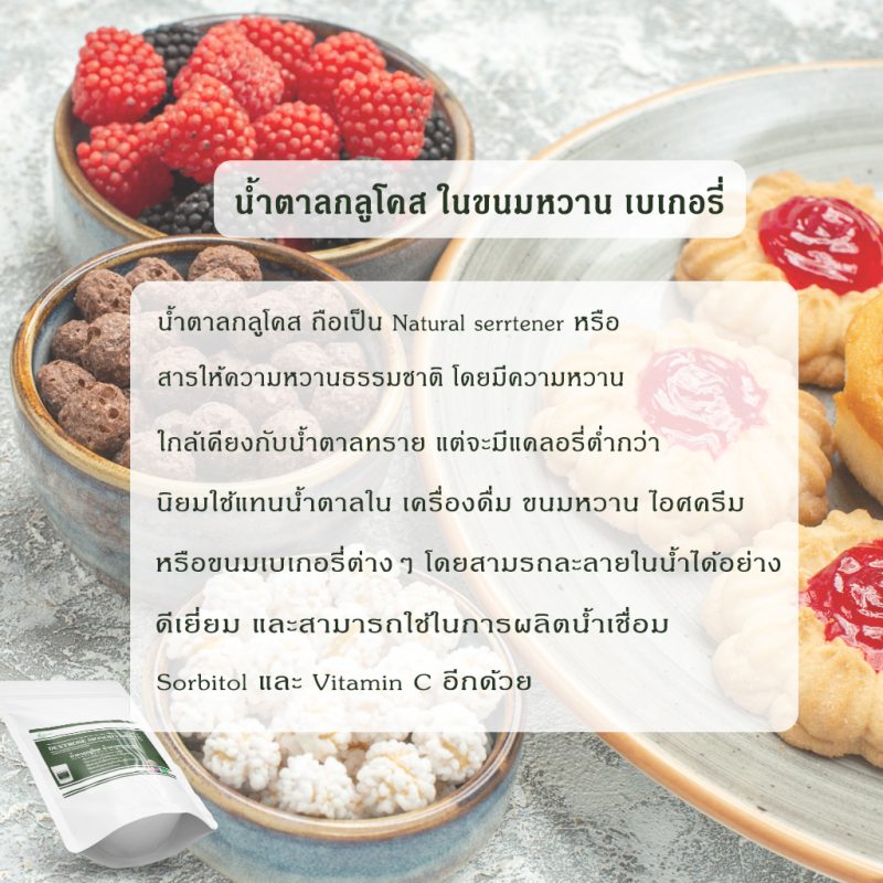 เป็นสารให้ความหวานธรรมชาติ (Natural Sweetener) โดยสามารถละลายในน้ำได้ทั้งหมด ซึ่งหลังการละลายจะเป็นสารละลายใส เป็นรูปแบบผลึกของน้ำตาลกลูโคส มีสีขาว ให้ความหวานใกล้เคียงกับน้ำตาลทราย ใช้เป็นสารตั้งต้นผลิตวิตามินซีได้ ใช้ผสมทำน้ำเชื่อชนิดต่างๆ เช่น Sorbitolได้; ใช้แทนน้ำตาล ผสมในเครื่องดื่ม ขนมหวาน เบเกอรี่ หรือ ไอศกรีมได้ โดยให้แคลอรี่ต่ำกว่าน้ำตาลนิดหน่อย